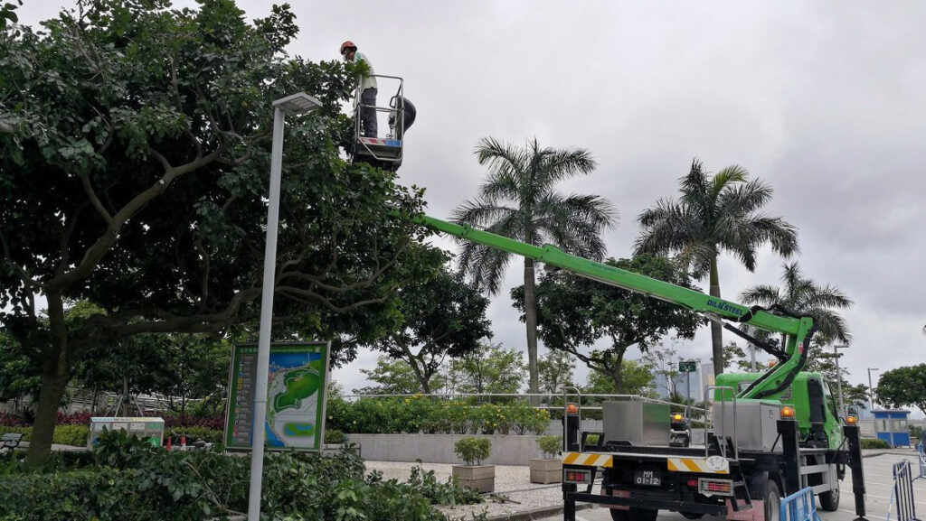 當本澳懸掛八號或以上風球期間,為保障公眾安全,市政署管轄的綠化及休憩設施暫停開放使用。同時,市政署會安排民防人員候營,巡查和處理緊急綠化問題。八號風球除下後,市政署會迅速巡視及評估樹木受損程度,並優先處理全澳各條主幹道的塌樹或枝條節斷事件,盡快開通道路,以減低對公眾及車輛通行的影響。