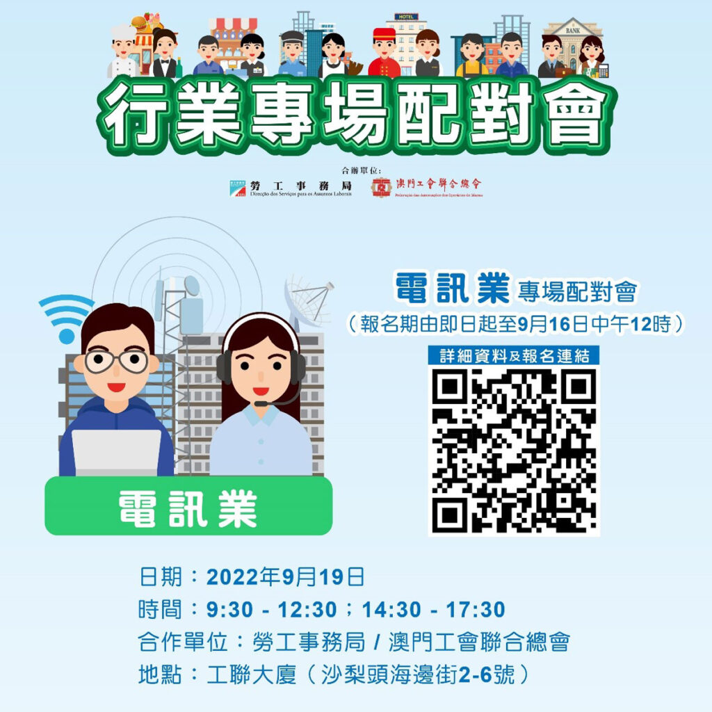 勞工局持續與工聯合作,9月19日在工聯大廈(沙梨頭海邊街2-6號)舉辦電訊業專場配對會,提供客戶服務範疇的後勤支援、資訊技術支援等崗位,以及客戶熱線代表、電訊服務技術員、高級程式分析員、網絡技術員等合共36個職位空缺。