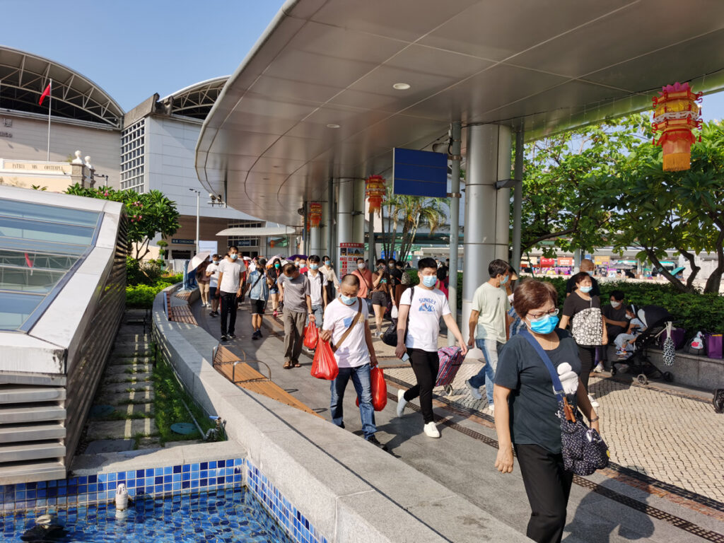 【本報訊】十一黃金周假期第 4天適逢重陽節,下午關閘口岸一帶人流暢旺,不少人手持行李箱來澳,當中不乏一家大細的家庭旅客,發財巴停泊區和關閘地下巴士總站有不少人候車,現場有人員協調乘客排隊。