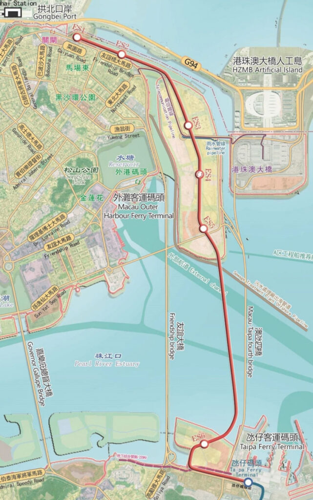 特首上月宣佈,輕軌東線將租用內地土地,延伸至青茂口岸。林煒浩進一步介紹,現時方案東線ES1車站(關閘站)將設置在灘塗整治區內,並預留向西延伸至青洲站(青茂口岸)條件;若日後能成功取得俗稱V形地塊(關閘旅遊巴停泊處東側的內地海面土地),則ES1車站將移向關閘方向,並在V形地塊內建造盾構井。