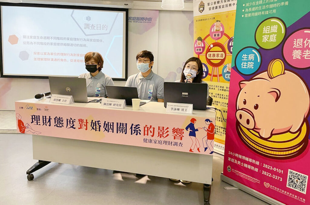 中心主任胡慧嫻、社工李詠琳,聖公會調查研究中心研究員陳浩輝分別稱,調查顯示,受訪者的財務及婚姻關係大致健康,唯理財行為中較少規劃家庭的財務目標及按目標去達成,而初婚夫婦的金錢溝通滿意度較低,年青夫婦多用高壓方式處理衝突。