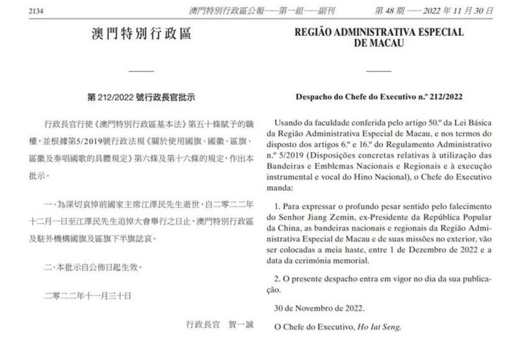 一、為深切哀悼前國家主席江澤民先生逝世,自二零二二年十二月一日至江澤民先生追悼大會舉行之日止,澳門特別行政區及駐外機構國旗及區旗下半旗誌哀。