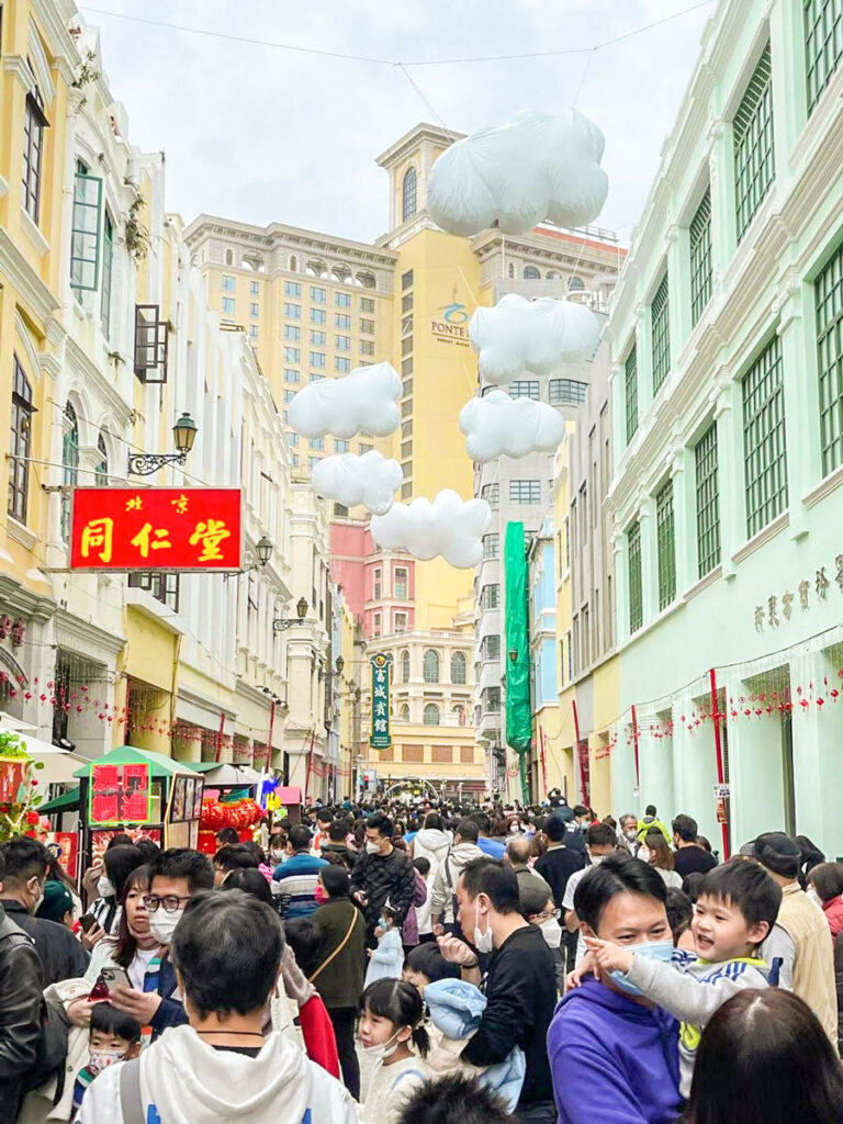 昨日中午12時,新馬路步行區人流逐漸增多,不少人於大型裝置前面拍照留念、逛攤檔,有人架起畫板寫生,藝遊點的表演者載歌載舞;活動吸引不少小朋友到場耍樂,冰糖葫蘆、雪糕、棉花糖攤位更是大受歡迎,小朋友們大吃朵頤。下午3時40分,該區實施人潮管制措施,公眾只可由新馬路與蘇雅利醫士街交界口,進入往十六浦方向的一段步行區,其餘路段只出不進。多名警員在場,秩序良好。