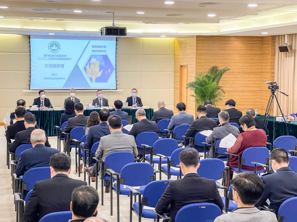 交流座談會於7日上午10時至12時半在政策研究和區域發展局會議室舉行。政發局張作文局長、綜合支援廳黎宇明廳長,經濟及科技發展局戴建業局長,以及旅遊局許耀明副局長等官員出席,與澳門銀行公會葉兆佳主席、澳門經濟建設協會楊道匡理事長、澳門旅遊學院黃竹君院長、澳門經濟學會劉本立會長、澳門展貿協會林中賢會長等20多位社會人士就「促經濟」及「旅遊+消費」兩個主題作深入交流。