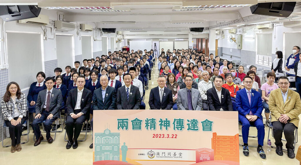 【本報訊】為讓值理同仁、全體師生、員工及服務使用者深入了解本年兩會的情況,同善堂於3月22日舉辦 「兩會精神傳達會」,特邀澳區全國人大代表、同善堂值理會值理何敬麟及澳區全國政協委員、同善堂值理會值理兼同善堂中學校監莫志偉任主講嘉賓,與會者包括同善堂值理會主席崔世平、副主席劉藝良、馬有友、值理陸永根、李俊鳴、石崇榮、黃焯華、莊麗晶等,聯同現場及直播約450名師生、同善堂長者活動中心會員、各單位員工同參與。
