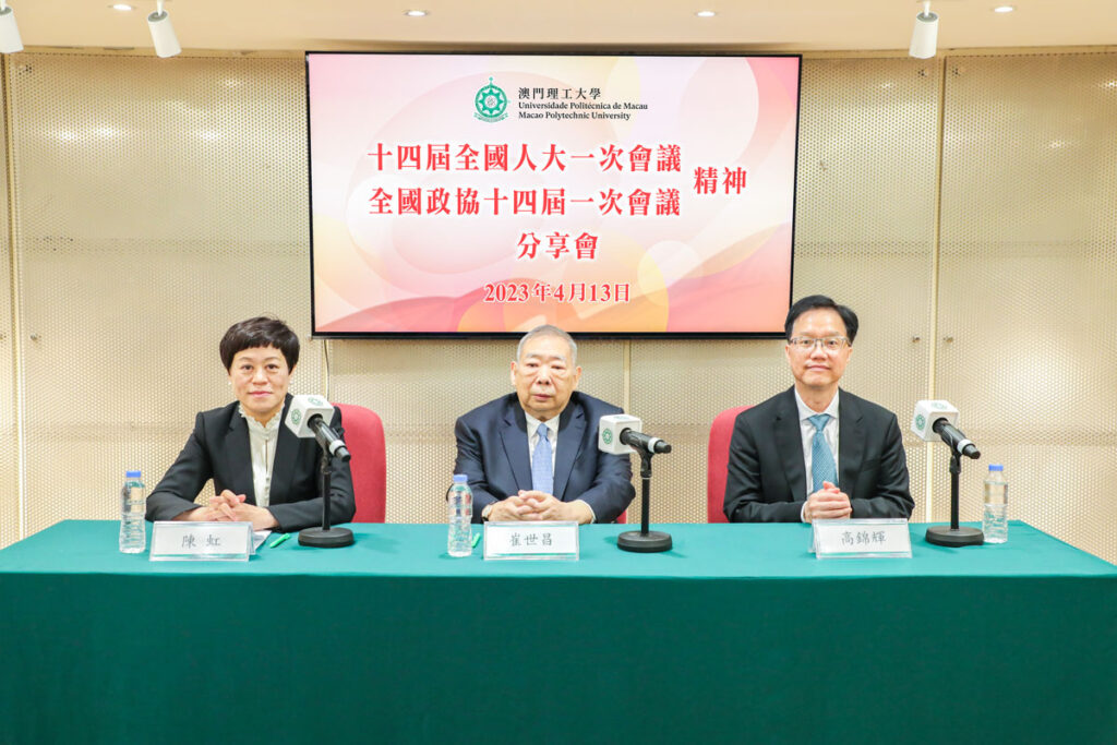 【本報訊】理工大學消息,為加深師生對國事的認識,準確理解國家重大政策和社會發展方向,澳門理工大學於4月13日上午舉辦「十四屆全國人大一次會議、全國政協十四屆一次會議精神分享會」,邀請全國政協常委、校董會主席崔世昌,澳區全國人大代表、校董會成員陳虹,以及全國政協澳區委員高錦輝主講,分享兩會的主要內容、精神要點和學習體會,弘揚愛國愛澳的核心價值。出席分享會的包括大學行政管理委員會成員、主管及師生校友等百餘人。