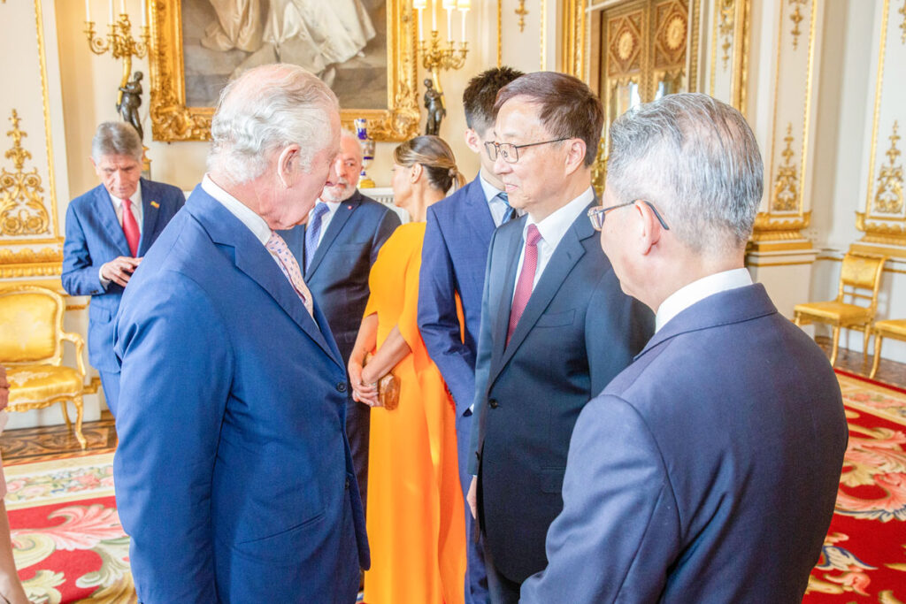 韓正向查爾斯三世國王轉達了習近平主席對國王伉儷、英國王室及人民的誠摯祝賀和良好祝願,感謝英方為其英國之行做出的周到安排。