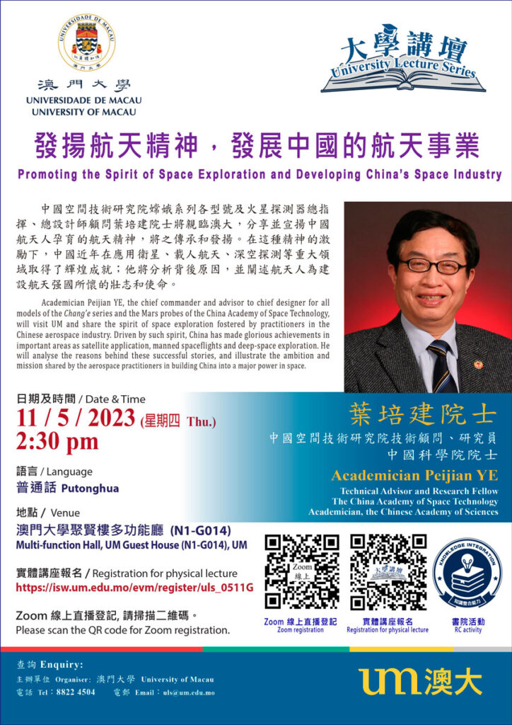 【本報訊】澳門大學消息,澳門大學將於5月11日舉辦「大學講壇」講座,由中國空間技術研究院技術顧問暨研究員、中國科學院院士葉培建擔任講者,就「發揚航天精神,發展中國的航天事業」為題發表演說。講座將線上線下同步舉行,歡迎有興趣人士參加。