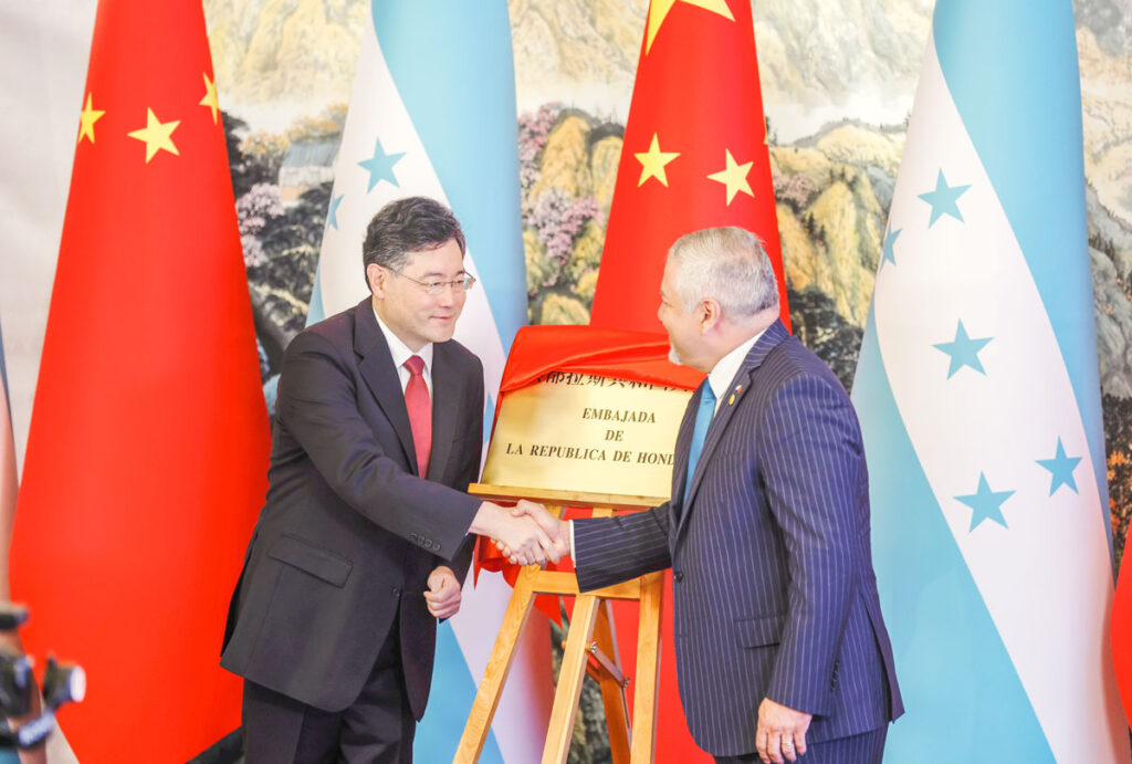 【中新社北京6月11日電】6月11日上午,中國國務委員兼外長秦剛在北京出席洪都拉斯駐華使館開館儀式,同洪都拉斯外長雷納共同為使館揭牌。
