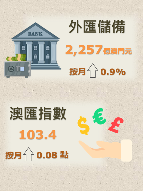 【本報訊】澳門金融管理局16日公佈,2024年1月底澳門特別行政區的外匯儲備資產總額,初步統計為2,257億澳門元(280.3億美元),較2023年12月經修訂總額2,236億澳門元(277.7億美元),上升了0.9%。2024年1月底的外匯資產總額,約相當於2023年12月底澳門流通貨幣的11倍或廣義貨幣供應(M2)中屬於澳門元部分的91.1%。