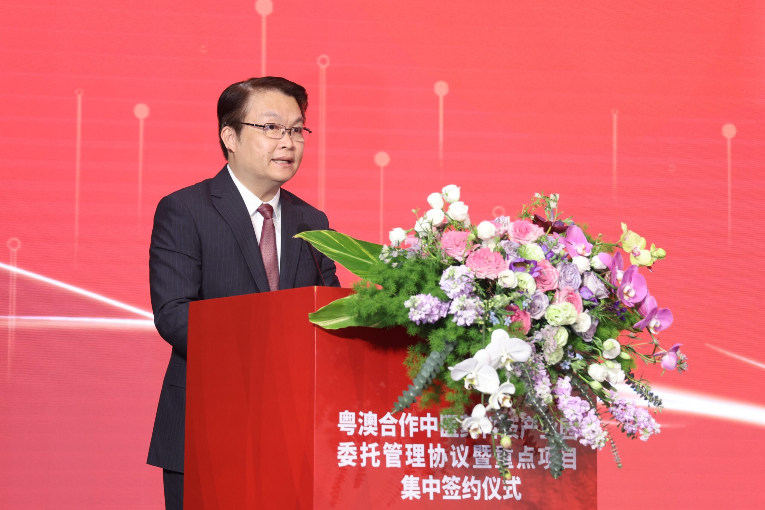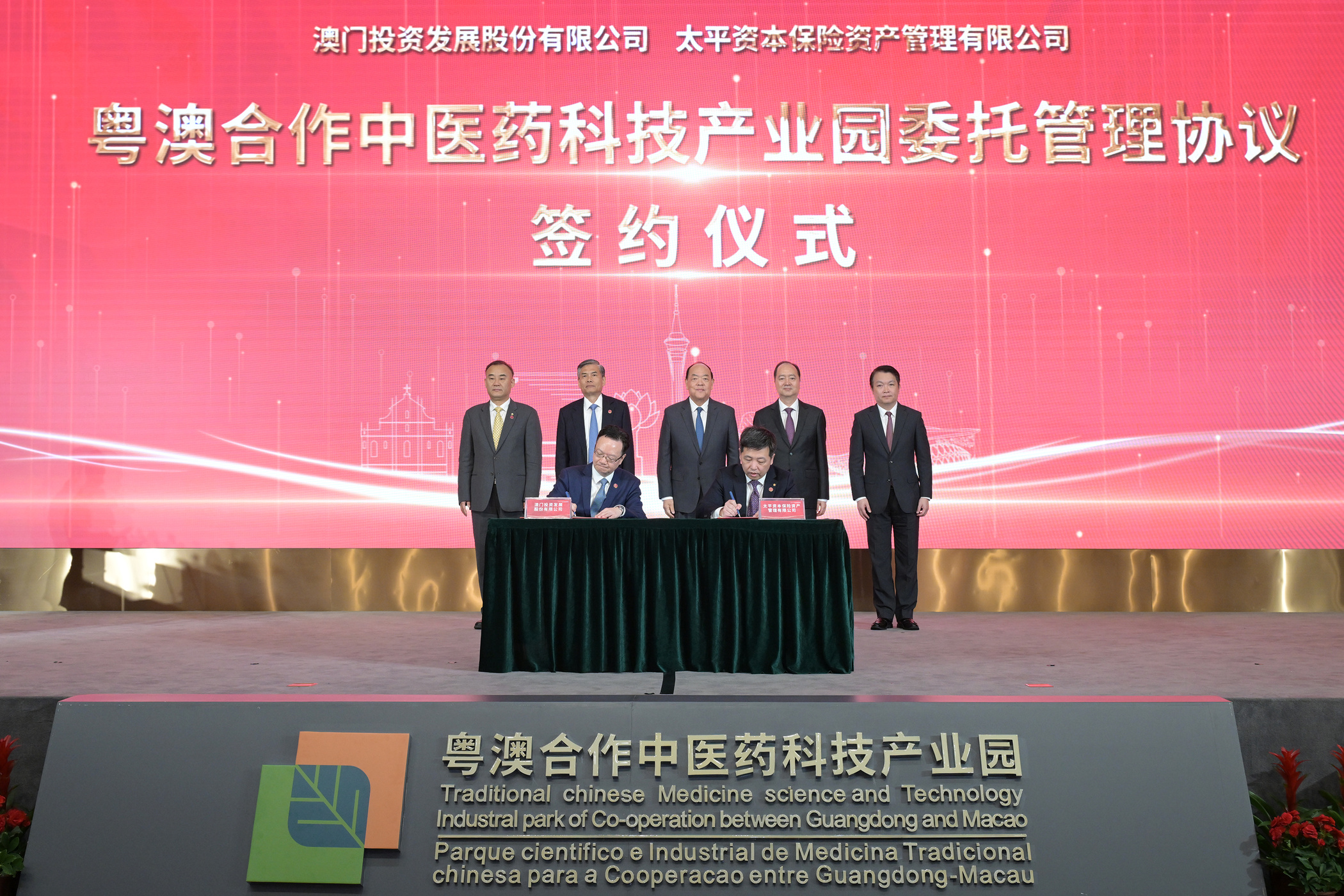 在澳門特別行政區行政長官、橫琴粵澳深度合作區管理委員會主任賀一誠,中央人民政府駐澳門特別行政區聯絡辦公室主任鄭新聰,中國太平保險集團董事長王思東,澳門特別行政區經濟財政司司長、橫琴粵澳深度合作區執行委員會主任李偉農和中國太平保險集團副總經理李可東見證下,由澳門投資發展股份有限公司主席吳建峰與太平資本保險資產管理有限公司總經理吳松代表雙方簽署《粵澳合作中醫藥科技產業園委托管理協議》,正式建立委托管理關係,共同推進產業園提升服務品質,加快產業聚集。國家中醫藥管理局局長余艶紅,副局長兼中國中醫科學院院長黃璐琦,廣東省政府橫琴辦主任、橫琴粵澳深度合作區執行委員會副主任聶新平,中國銀行業務管理總監趙蓉,中國工程院院士、中醫證候全國重點實驗室主任劉良教授等出席簽約儀式。