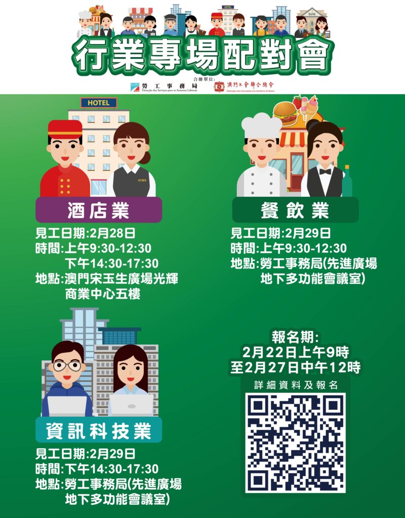 【本報訊】為協助有求職需求的澳門居民盡快就業,以及為緩解業界的人資需求的壓力,勞工事務局與澳門工會聯合總會合作2月底舉辦3場行業專場配對會,合共提供279個空缺。報名日期為2月22日上午9時至2月27日中午12時。