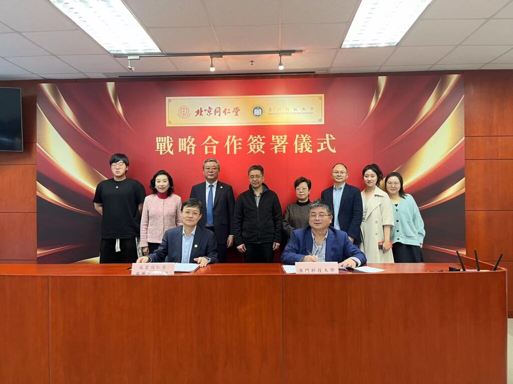 《芪藥丸對改善高脂飲食加STZ模型誘導的糖尿病腎病藥效驗證及機制研究》協議簽署儀式在北京同仁堂國藥有限公司舉行,由澳門科技大學協理副校長、藥學院院長朱依諄院士與北京同仁堂國藥董事長顧海鷗簽署。