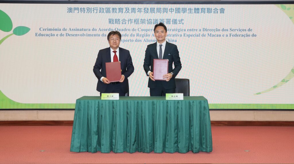 【本報訊】為促進內地與澳門學生的體育交流,加強兩地學生體育運動發展、人才培養、賽事組織等領域的合作,教育及青年發展局局長龔志明與中國中學生體育聯合會主席兼秘書長劉立新於早前在教青局簽署《澳門特別行政區教育及青年發展局與中國學生體育聯合會戰略合作框架協議》。協議內容包括為今年6月23日至7月3日在澳門舉行的2024年世界中學生籃球錦標賽提供賽事技術支援,支持更多澳門學校參與內地舉辦的學生體育賽事、體育相關培訓以及講座等。