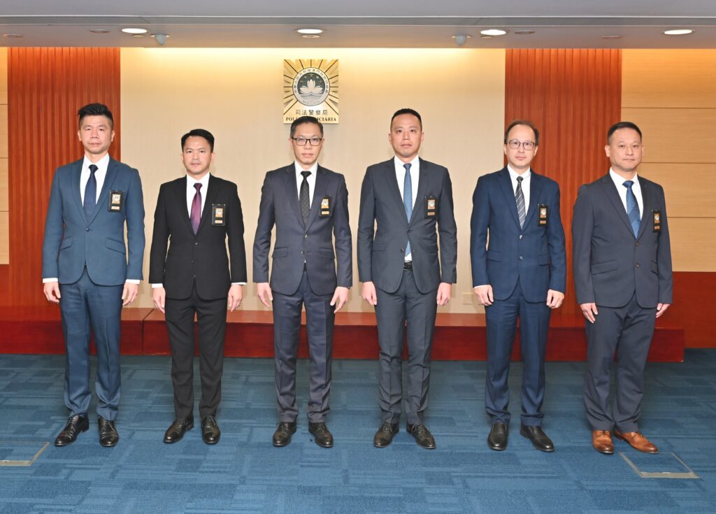 【本報訊】司法警察局於2024年5月16日在總部大樓舉行主管就職儀式,在薛仲明局長監誓,並在賴文威、蘇兆強、岑錦榮三位副局長及各部門主管的見證下,賴釗洪二等督察宣誓就任保安廳廳長、劉永權副督察宣誓就任特別調查處處長。