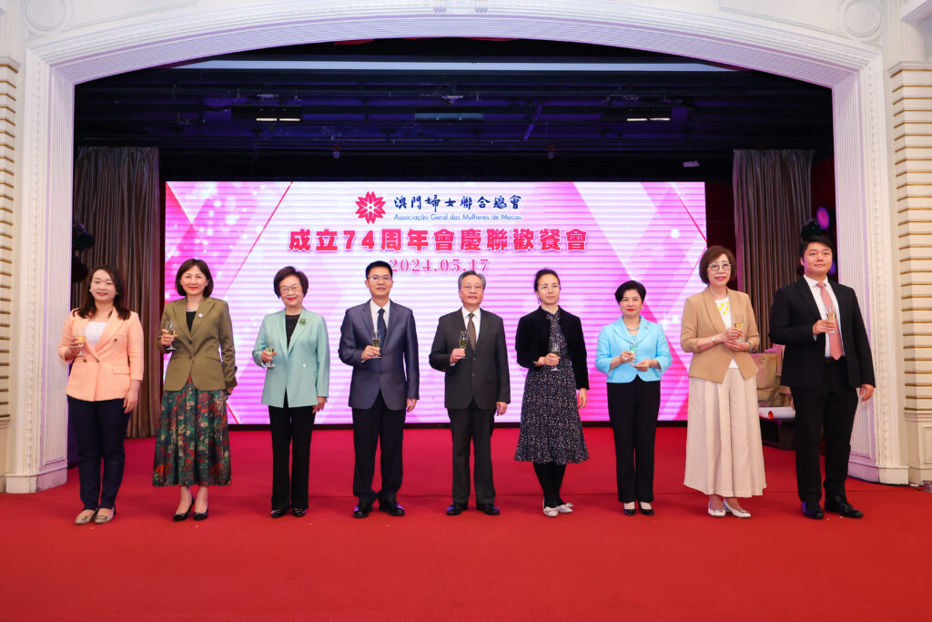 【本報訊】澳門婦女聯合總會昨晚舉行慶祝成立七十四周年會慶聯歡餐會,立法會主席高開賢、澳門中聯辦公室社工部副部長姜正宇、外交部駐澳門特派員公署政研室主任馬乃芳參贊和澳門婦女聯合總會永遠會長賀定一等出席。