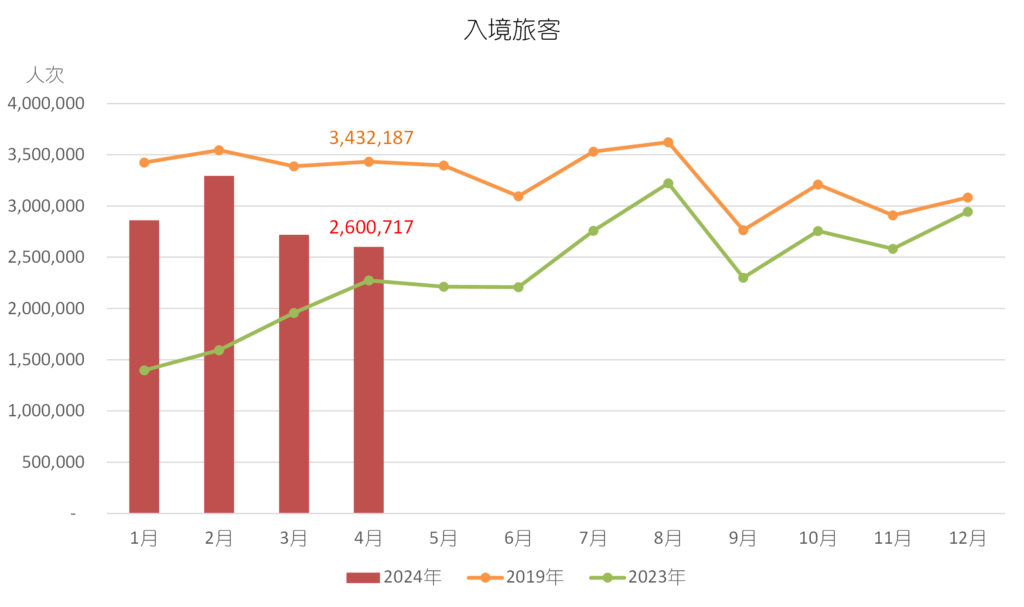2024年首四個月的入境旅客共11,476,474人次,按年上升58.9%,恢復至2019年同期的83.2%;不過夜旅客(6,141,648人次)及留宿旅客(5,334,826人次)按年分別增加80.3%及39.8%。旅客平均逗留1.2日,較去年同期下跌0.1日;留宿旅客(2.2日)及不過夜旅客(0.2日)的平均逗留時間均縮短0.1日。