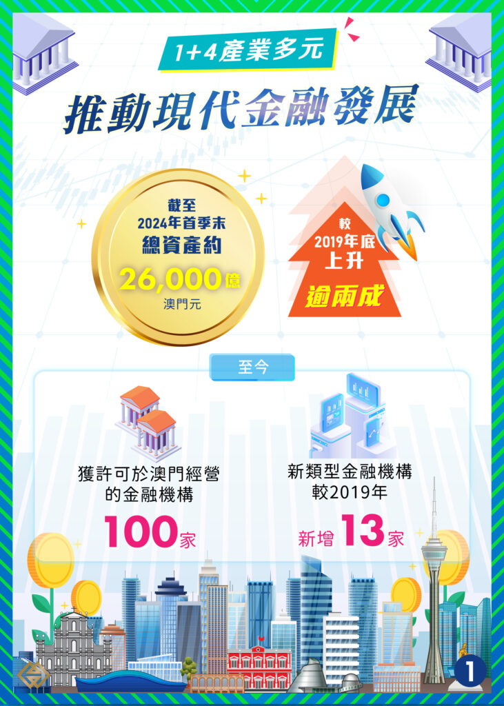 【本報訊】發揮高度開放的金融體系及對接國際的金管制度優勢,澳門持續引進新類型的金融機構,金融業態漸趨多元。按初步統計,截至今年首季末,澳門金融業總資產約26,000億澳門元,較疫情前的2019年底上升逾兩成。至今獲許可於澳門經營的金融機構共100家,新類型金融機構較2019年新增了13家。