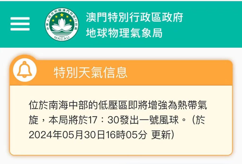 澳門特別行政區 政府 地球物理氣象局將於17:30發出一號風球