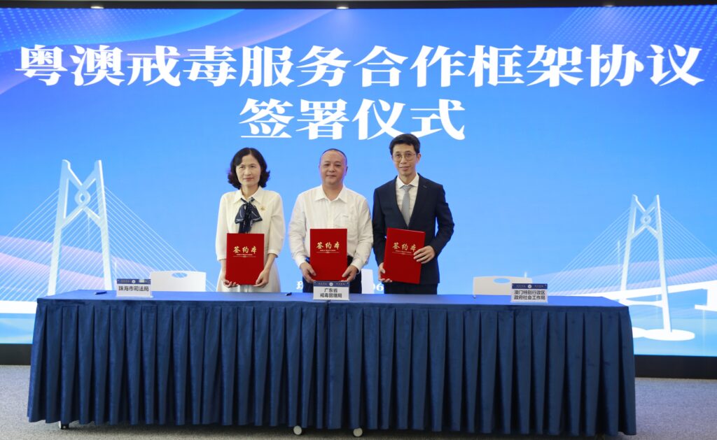 【本報訊】為推進粵港澳大灣區建設,持續深化粵澳在戒毒服務和禁毒普法宣傳的合作,澳門特區政府社會工作局與廣東省戒毒管理局、珠海市司法局於6月21日在橫琴粵澳深度合作區涉外公共服務中心簽署「粵澳戒毒服務合作框架協議」。