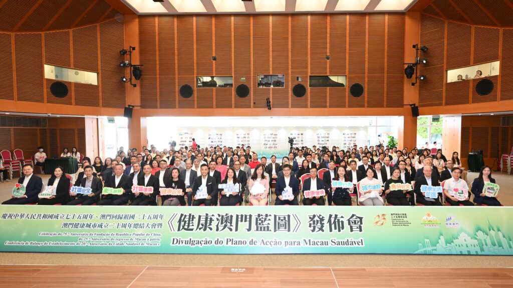 【本報訊】衛生局昨日上午假科學館會議廳舉行慶祝中華人民共和國成立七十五周年、澳門回歸祖國二十五周年-澳門健康城市成立二十周年總結大會暨《健康澳門藍圖》發佈會。社會文化司司長歐陽瑜、中聯辦宣文部部長萬速成、推動澳門健康城市建設的委員會成員、機構、社團及企業代表等出席。