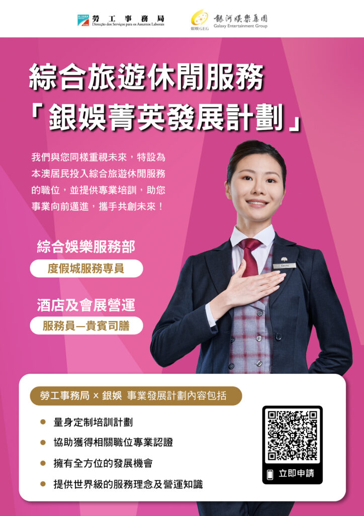 【本報訊】為支持本地人才全面發展,拓展多元職涯路向,勞工事務局和銀河娛樂集團(下稱「銀河娛樂」)合作推出「銀娛菁英發展計劃(綜合娛樂服務及酒店營運範疇)」(下稱「計劃」),以「先入職、後培訓」方式,為有志投身綜合休閒旅遊服務行業的澳門居民提供全方位培訓及發展階梯,計劃由8月13日起接受申請。