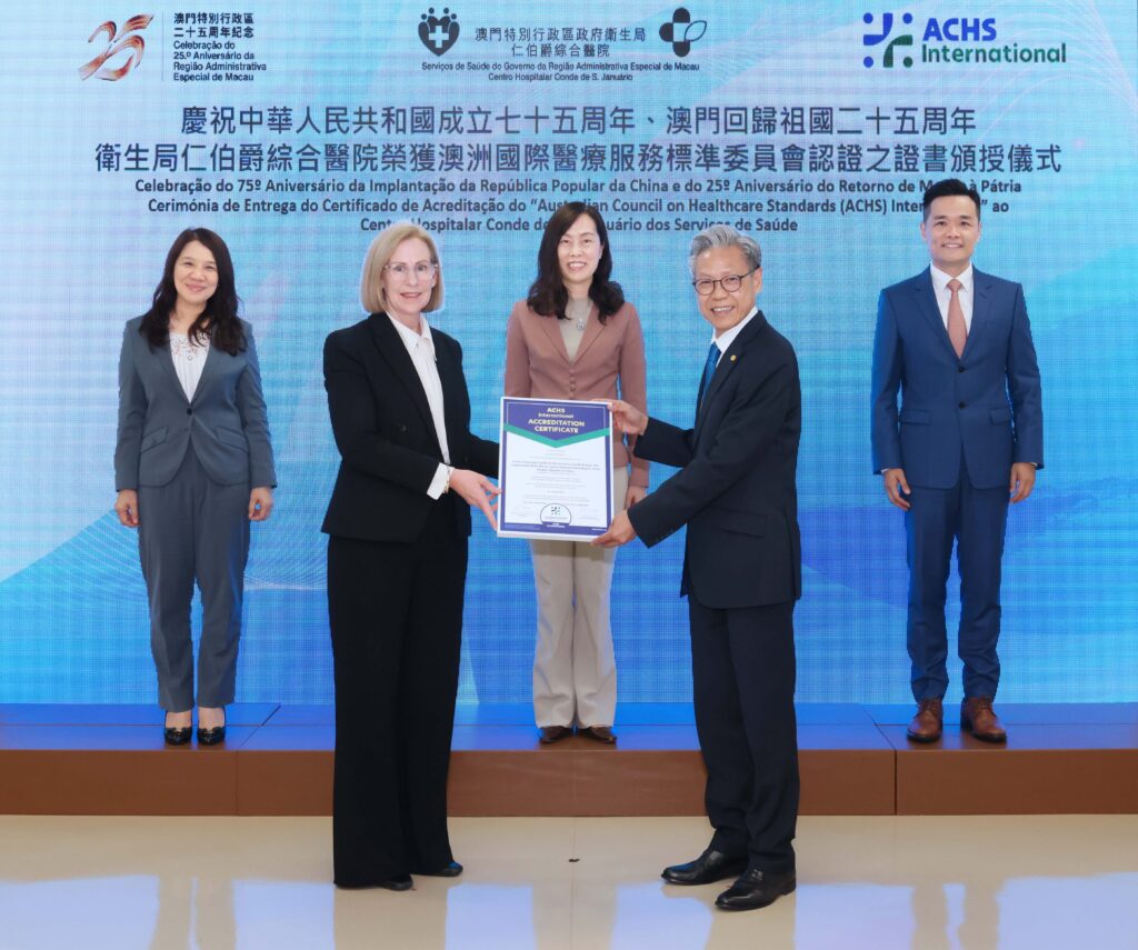 8月26日,衛生局舉行了「慶祝中華人民共和國成立七十五周年、澳門回歸祖國二十五周年、衛生局仁伯爵綜合醫院榮獲澳洲國際醫療服務標準委員會認證之證書頒授儀式」,在社會文化司歐陽瑜司長、社會文化司司長辦公室何鈺珊主任、衛生局羅奕龍局長的見證下,由澳洲國際醫療服務標準委員會(ACHSI)的Louise Cuskelly執行董事向仁伯爵綜合醫院郭昌宇院長頒授證書。
