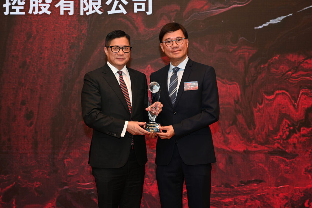 澳博控股獲《亞洲週刊》頒發2022-2023年度全球卓越ESG大獎,澳娛綜合總裁 - 保安監察,環境、社會及管治洪克偉(右)代表公司從香港特別行政區保安局局長及主禮嘉賓鄧炳強手中接過獎項。