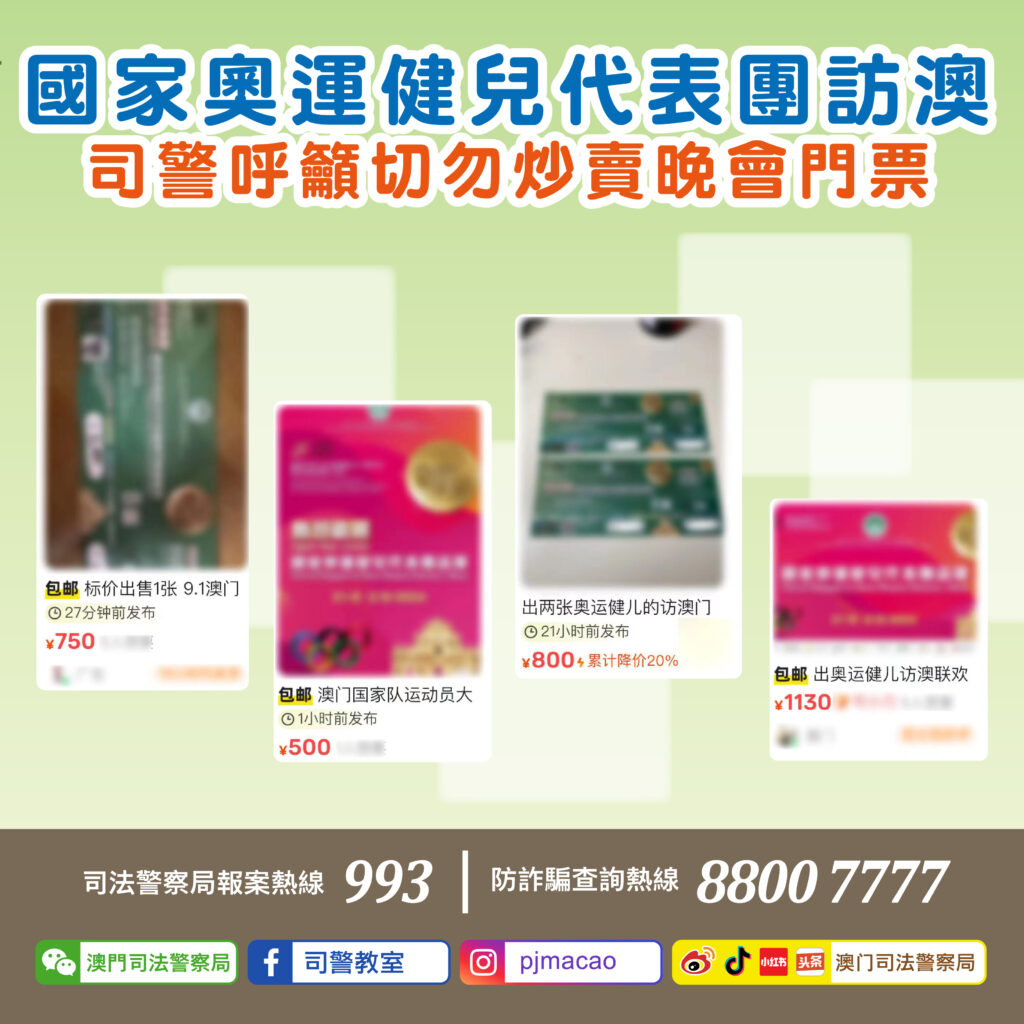 【本報訊】近日,司法警察局發現有人於網絡社交平台炒賣「我們的驕傲—國家奧運健兒代表團澳門聯歡晚會」門票。