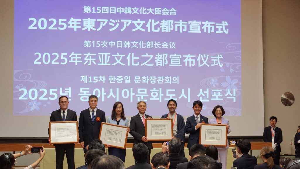 第十五次中日韓文化部長會議於9月12日在日本京都舉行,其間舉行了2025年「東亞文化之都」授牌儀式,由三國文化部門代表:中華人民共和國文化和旅遊部副部長張政、日本文部科學大臣盛山正仁及韓國文化體育觀光部第一次官龍昊聲分別向中國澳門特別行政區、中國湖州市、韓國安城市及日本鎌倉市之代表授牌。歐陽瑜致辭時表示,2025年「東亞文化之都」的殊榮,是對澳門在城市文化建設工作的肯定,澳門曾是海上絲綢之路的重要節點與貿易樞紐,在東亞文化交流上,一直擔當重要角色,將持續發揮中西文化薈萃、國際交流廣泛的優勢,藉「東亞文化之都」的城市創建,進一步助力和深化中日韓的文化和旅遊交流合作,為開拓亞洲文明對話作出貢獻。其後,澳門特別行政區政府代表團成員亦出席了中日韓藝術節,並藉着今日的授牌儀式活動,與日本及韓國2025東亞文化之都城市鐮倉市及安城市就來年的文化合作洽談交流項目。