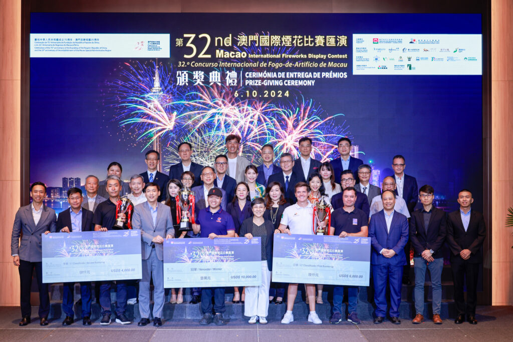 【本報訊】由旅遊局主辦的慶祝中華人民共和國成立75周年、澳門回歸祖國25周年第32屆澳門國際煙花比賽匯演於昨日晚上圓滿落幕並舉行頒獎典禮。來自世界各地的10間煙花公司施展渾身解數,在橫跨9月和10月的五個煙花夜爭妍綻放。經過一輪角逐,最終由來自中國內地的東信煙花公司奪得冠軍寶座,俄羅斯的Pyro-Klass煙花公司及日本的株式會社丸玉屋小勝煙火店分別奪得亞軍及季軍。