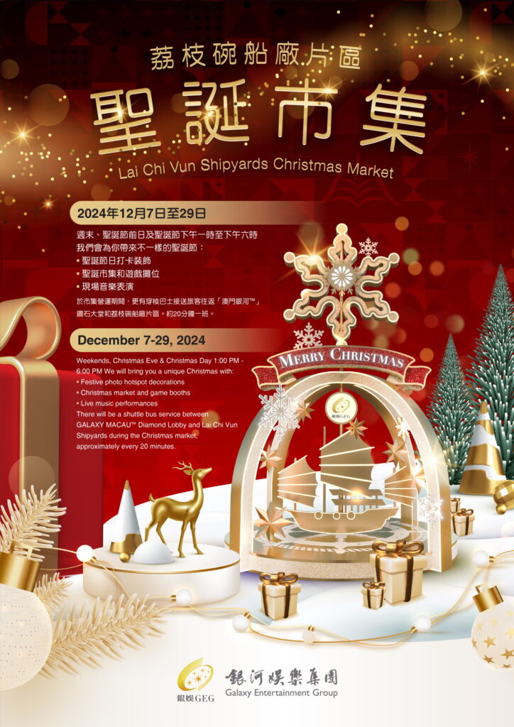 為豐富片區文旅元素,12月期間逢周六、日及12月24日至25日下午1時至6時將設有聖誕市集,內容包括特色遊戲攤位、餐飲設施、文創市集、藝文表演、兒童騎聖誕鹿遊戲及聖誕裝飾等;由文化局主辦,銀河娛樂集團合作舉辦的中國與葡語國家電影展「戶外放映-澳門影像‧新勢力」將於12月7日下午4時在荔枝碗船廠片區上映,以本年度4部「澳門影像新勢力」短片為主角,讓參與者感受本地影人用鏡頭表現澳門不同面貌的影像創作力,已獲錄取人士敬請準時入場。