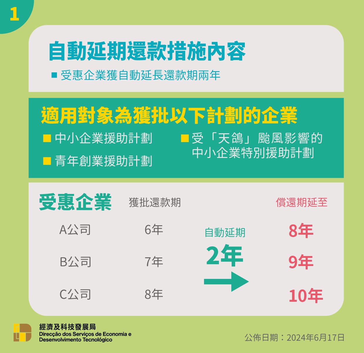 為紓緩中小企業償還貸款的壓力,特區政府透過第22/2024號行政法規,將上述計劃的還款期上限由8年延長至10年,相關措施於2024年6月18日起生效。經科局以有序分批的方式,透過手機短訊及公函通知各受惠企業有關調整還款期的安排,受惠企業無須提出申請,藉以達到便民便商之目的。