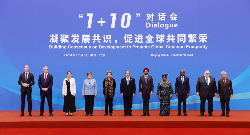 【中新社北京12月9日電】12月9日,中國國務院總理李強在北京釣魚臺國賓館同新開發銀行行長羅塞芙、世界銀行行長彭安傑、國際貨幣基金組織總裁格奧爾基耶娃、世界貿易組織總幹事伊維拉、聯合國貿易和發展會議秘書長格林斯潘、國際勞工組織總幹事洪博、經濟合作與發展組織秘書長科爾曼、國際清算銀行總經理卡斯滕斯、金融穩定理事會主席諾特、亞洲基礎設施投資銀行行長金立群舉行「1+10」對話會,圍繞「凝聚發展共識,促進全球共同繁榮」主題深入交流。