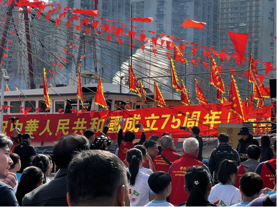 隨後,25艘漁船浩浩蕩蕩地從青洲塘碼頭揚帆出海。漁船沿著內港航道巡遊,途經媽閣廟、西灣大橋、旅遊塔及觀音像等地標景點,場面壯觀無比。海面上,各艘漁船懸掛著鮮艷的國旗和區旗,「慶祝澳門回歸祖國25周年」等大型慶祝標語格外醒目,引得沿岸不少市民和遊客駐足留影。