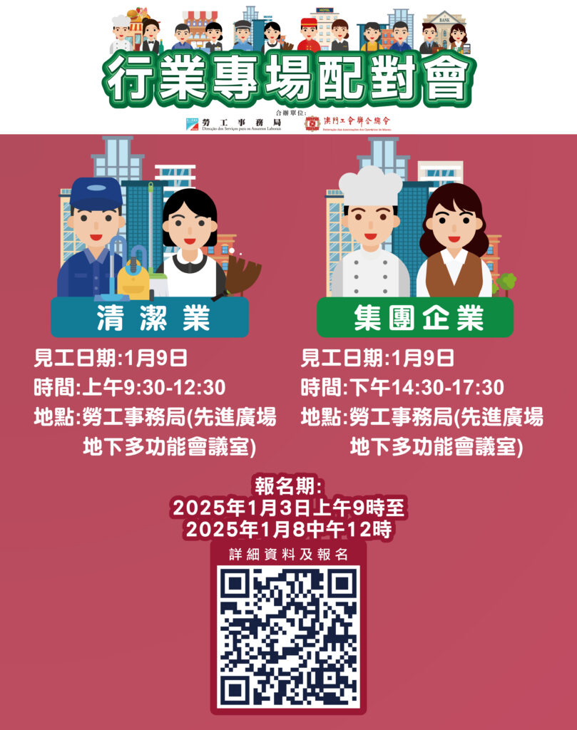 【本報訊】為協助有求職需求的澳門居民盡快就業,以及為緩解業界的人資需求壓力,勞工事務局與澳門工會聯合總會合作1月第二周舉辦2場行業專場配對會,合共提供100個空缺。報名日期為1月3日上午9時至1月8日中午12時。