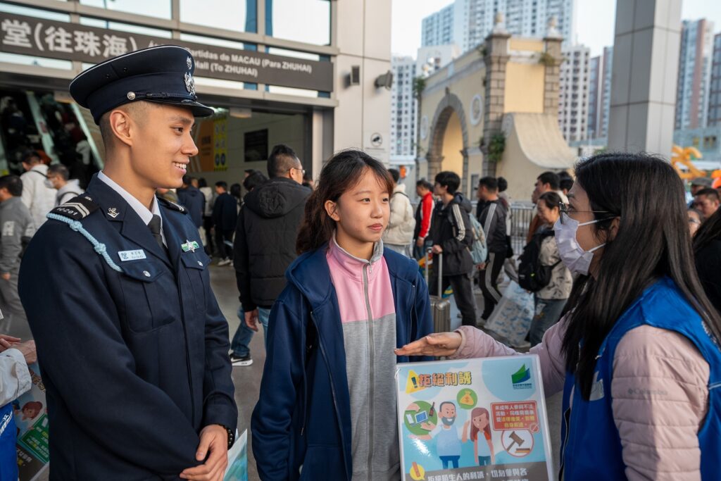 【本報訊】為加強青年學生的識法守法意識,尤其在春節長假期間提高警覺,教青局聯同澳門海關跨部門合作,在關閘口岸一帶進行社區推廣活動,提醒青年學生慎防不法份子的欺騙及利誘,切勿參與任何可疑及不法的活動如「走水貨」行為,以及切勿誤信來歷不明平台的招聘資訊、「賺快錢」等宣傳手段。同時,提醒青年學生及其家長,參與不法販運活動需要承受法律後果,不僅影響自身前途,還可能對家庭和社會造成負面影響,家長應以身作則,為子女樹立良好榜樣。