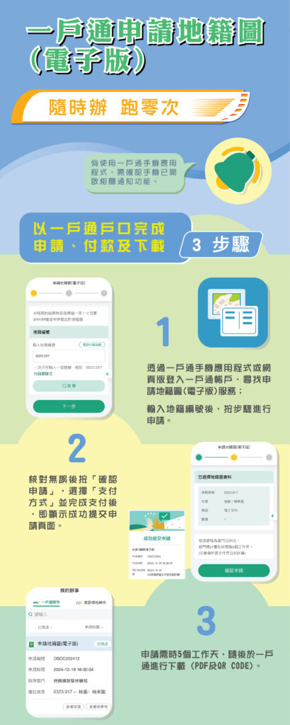 為進一步推進電子政務,「地籍圖(電子版)」申領服務已全面整合至「一戶通」平台,市民可透過手機應用程式或網頁版登入「一戶通」,完成申請、繳費及領取地籍圖(電子版),申請需時5個工作天。