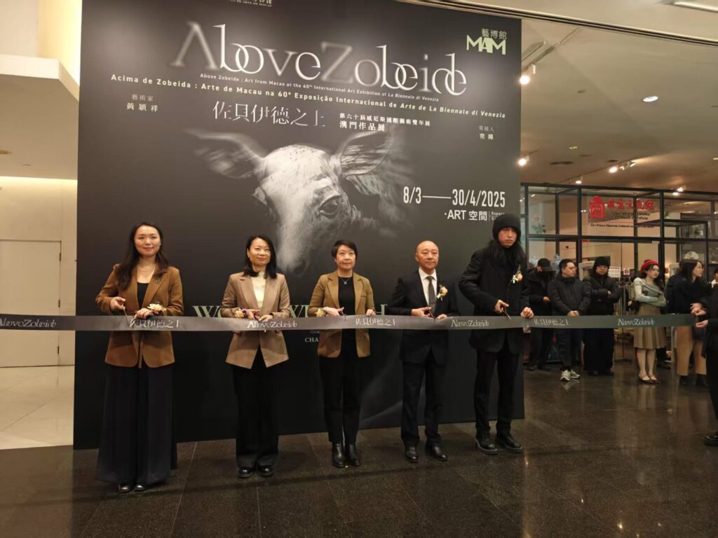 【本報訊】由文化局轄下藝術博物館主辦的「佐貝伊德之上——第六十屆威尼斯國際藝術雙年展澳門作品展」於昨日在藝術博物館一樓舉行開幕儀式,文化局局長梁惠敏、中聯辦宣傳文化部副部長白冰,美術協會會長陸曦,展覽藝家黃穎祥,以及策展人常嬋等出席主禮。展覽藉異托邦中的身份叩問,以澳門視角探討全球議題。