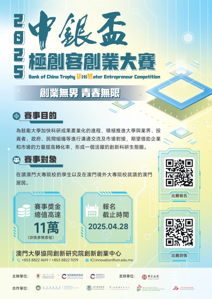 有興趣的合資格人士可由即日起至2025年4月28日登入網頁:https://go.um.edu.mo/ty70blff報名,詳情可瀏覽:https://cie.ici.um.edu.mo/zh/news-zh/2025-ultimater-cp/。查詢請聯繫澳大創新創業中心(電話:+85388224619或88229219;電郵:ICI.Innovation@um.edu.mo)。