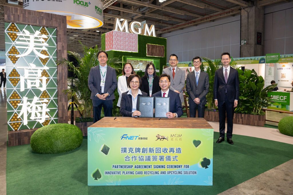 「撲克牌創新回收再造」合作協議簽署儀式於昨日下午假「2025年澳門國際環保合作發展論壇及展覽」(2025 MIECF)的美高梅展位舉行。