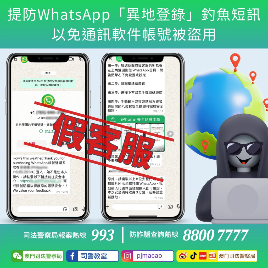 司警局反詐騙協調中心提醒,WhatsApp絕對不會透過 SMS 短訊或軟件訊息要求市民點擊「任何連結」處理帳號停權問題;務必在WhatsApp軟件中認清顯示有「藍色剔號」特徵的真實WhatsApp官方帳號;倘有親友透過任何通訊軟件提出索款要求,應立即循其他途徑與對方核實身份;如有懷疑,可使用司警局「反詐程式」查詢風險指數或上報資料,又或致電司警局防詐騙查詢熱線88007777及報案熱線993求助。