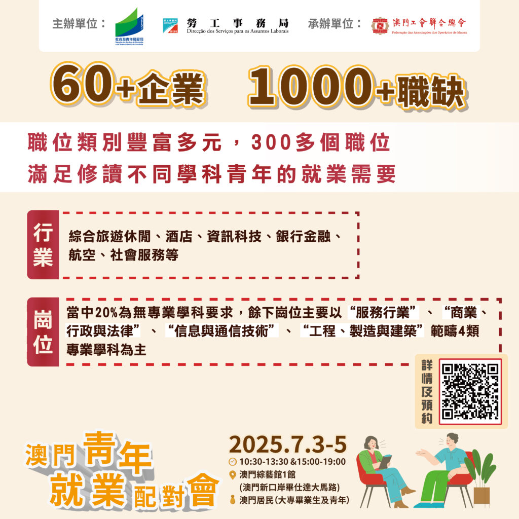 【本報訊】為全方位支援青年學業、就業、事業發展;特區政府透過跨部門協作,全面協助本地居民優先就業,由教育及青年發展局(下稱教青局)和勞工事務局(下稱勞工局)主辦,並由澳門工會聯合總會承辦的「澳門青年就業配對會」及「澳門青年職前輔導會」於7月3日至5日一連三日在澳門綜藝館舉行,為本澳企業與求職青年搭建選配平台,全方位助力青年裝備自己投入職場。