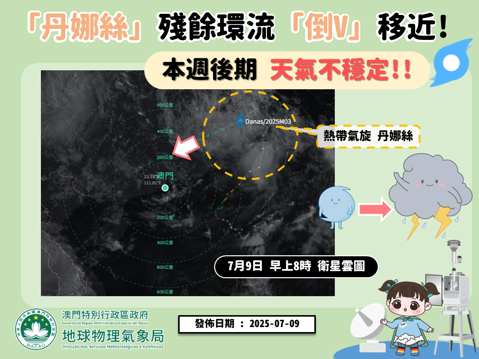 氣象局預料,隨著「丹娜絲」殘餘環流靠近,本週後期(7月10至12日初時)驟雨頻密,累積雨量高,間中有大驟雨及雷暴。而現時不同模式之間仍有分歧,部份模式更預料「丹娜絲」殘餘環流會以較接近沿岸路徑靠近珠江口,有利其環流強度維持甚至再度增強,屆時對本澳造成的影響將更為明顯,本局將密切監測其動態。