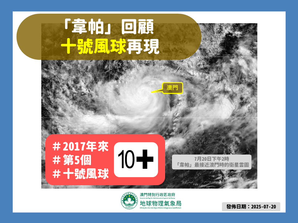 【本報訊】氣象局表示,「韋帕」成為自2017年來,9年內本澳第5個需要發出十號風球的熱帶氣旋。同時,亦是自1968年有記錄以來,發出日期最早的十號風球(舊記錄:布倫登,發出日期:24/07/1991),回顧一下「韋帕」特點。