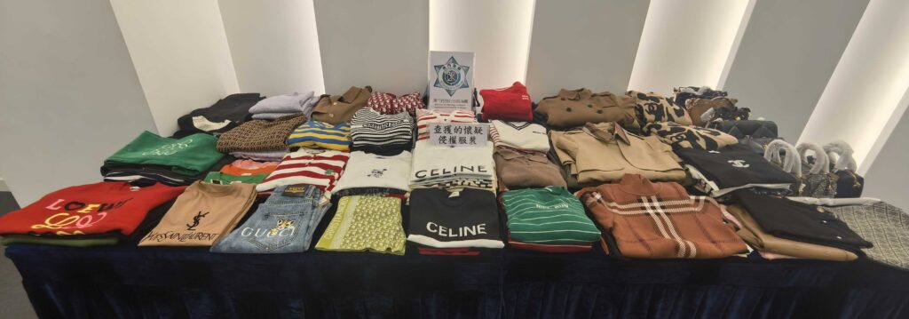 7月23日行動中,海關在店內及閣樓搜獲155件假冒多個國際知名品牌的服飾及手袋,包括BURBERRY、PRADA、GUCCI等,正價市值約239萬澳門元,實際售價僅500至2,300元不等。