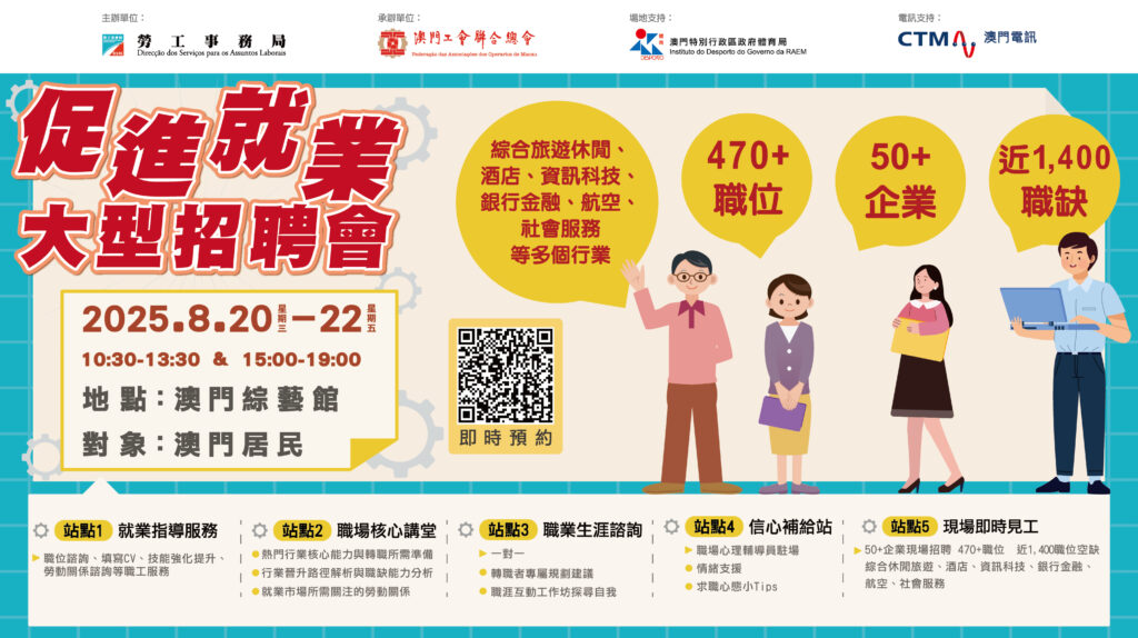 【本報訊】為全力促進各階層求職者對接就業及助力居民向上流動,由勞工事務局主辦、澳門工會聯合總會承辦的「促進就業大型招聘會」將於8月20日至22日假澳門綜藝館舉行,現場提供近1,400個職缺、約470多個職位供求職者選配和即場面試。