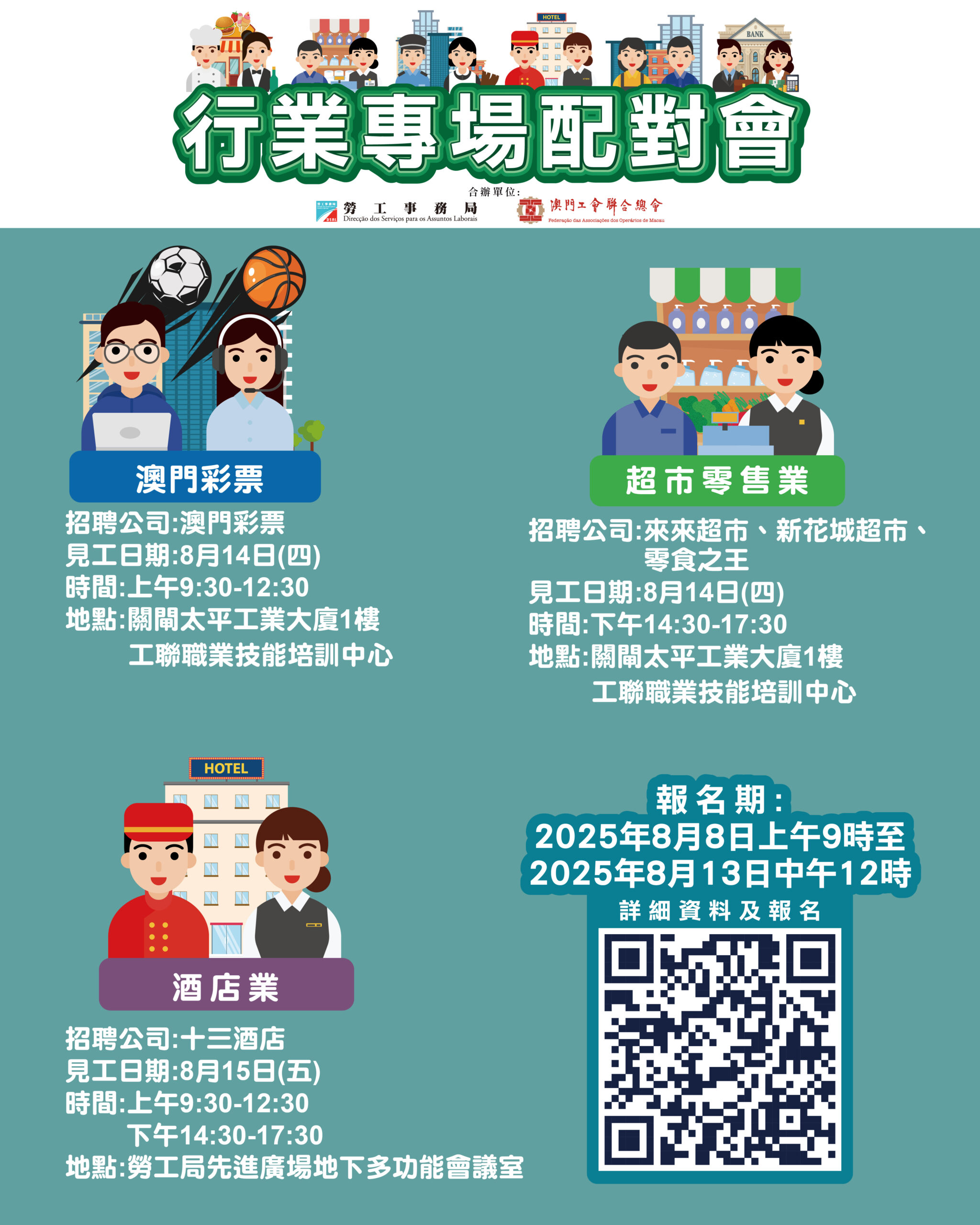 8月14日上午澳門彩票有限公司專場配對會及同日下午超巿零售業專場配對會在澳門工聯職業技能培訓中心(關閘馬路101-105A號太平工業大廈第一期1樓)舉行;8月15日全日酒店業專場配對會在澳門勞工事務局地下多功能會議室(澳門馬揸度博士大馬路221-279號先進廣場大廈)舉行。報名日期為8月8日上午9時至8月13日中午12時。