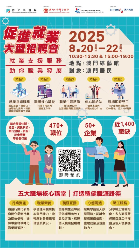 【本報訊】為全力促進各階層求職者對接就業及助力居民向上流動,由勞工事務局主辦、澳門工會聯合總會承辦的「促進就業大型招聘會」於8月20日至22日假澳門綜藝館舉行,由即日起至8月18日接受網上報名。