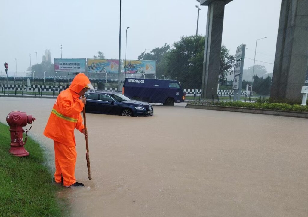 持續特大暴雨及潮漲,令多個低窪地區均出現水浸情況,暴雨主要集中在路氹區,氹仔菜園路、偉龍馬路、松樹尾、黑橋街、石排灣圓形地以及路環舊城區等水浸較嚴重,市政署緊急應變小組即時於全澳各區開展巡查和疏通渠道工作,重點關注水浸地區渠道的排水情況,即時清理被雜物或垃圾阻塞的去水井或集水井口,以保持排水暢通;並到多個雨水泵房巡視,確保各泵房運作正常,待雨勢減弱後,盡快排走積水。